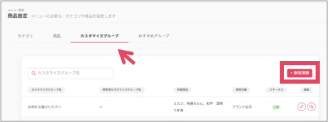 ②「カスタマイズグループ」を選択した状態で[新規登録]をクリック