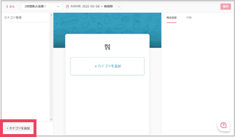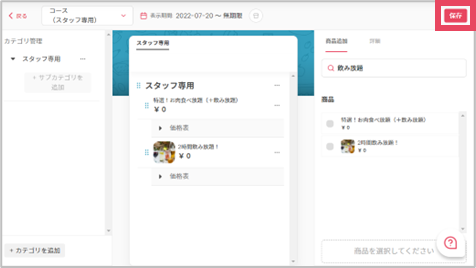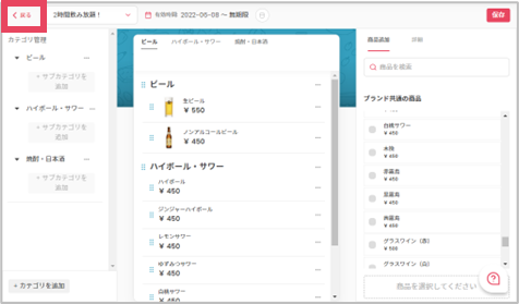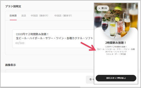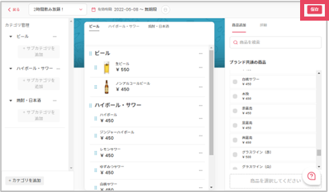 プラン設定では時間制限のある「飲み放題」・「食べ放題」用のメニューを作成します。