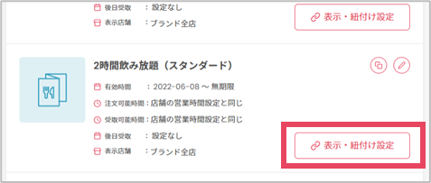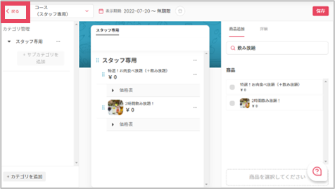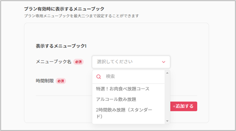 エンドユーザー画面に表示される飲み放題・食べ放題用の名称や、表示期間、注文可能時間をメニューブックで設定します。