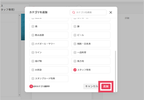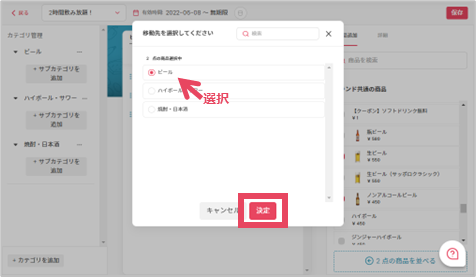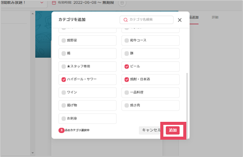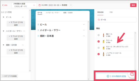カテゴリごとに(この画面でいうと「ビール」というカテゴリに所属させたい商品だけにまずチェックを入れて)[●点の商品を追加]をクリックしてください。