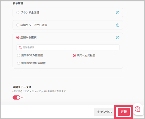 「店舗グループから選ぶ」「店舗から選ぶ」を選択して対象店舗を選択
