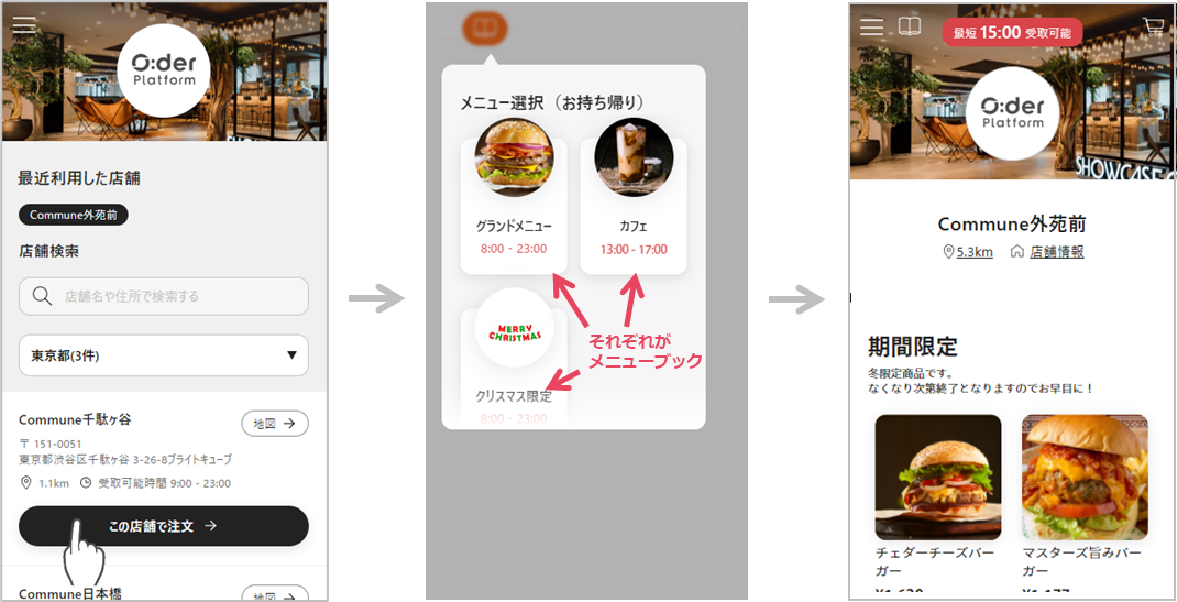メニューブックごとに赤い字で受取可能時間が表示されます。