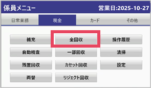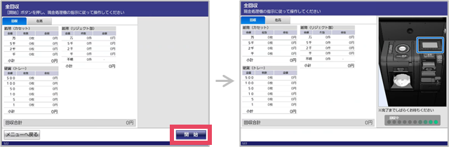 操作手順 ①[現金]をタップ ②[設定]をタップ ③[する]もしくは[しない]どちらか設定したい方をタップ 「する」を選択すると、「日計処理の現金回収動作」の[全回収]「残置回収]のボタンが押せるようになります。 全回収 :Kiosk内にある現金を全て回収します。 残置回収:つり銭準備金で設定した金額をKiosk内に残して現金を回収します。 どちらかを選択してください。 なお、「する」「しない」どちらかを選択すると設定が反映されます。更新ボタンはありません。 ...