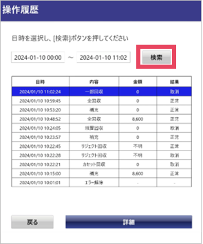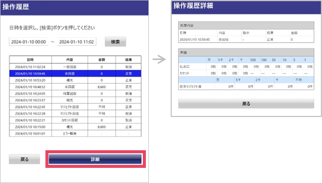 操作履歴を選択して[詳細]を押すと詳細画面が表示されます。