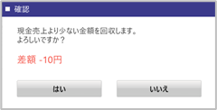 現金売上より少ない金額を回収しようとするとこの画面が表示されます。