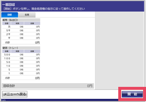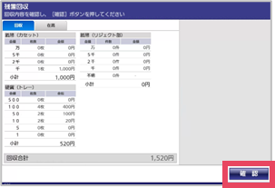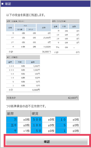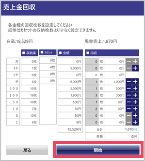 回収金額を変更したい場合はそれぞれの金種の「+」「-」で操作してください。