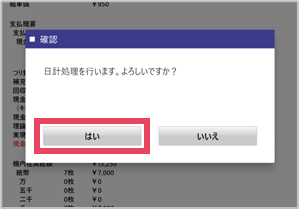 操作手順 ①本体の電源を入れ、開局をタップ 前日の日計完了後の伝票を修正したい場合、[前日に一時的に変更]をタップして前日分の操作を行います。 前日分の操作が完了後、改めて前日分の日計を行ってください。 日計処理後の機器起動時のみ開局画面が表示されます。 ②[はい]もしくは[いいえ]をタップ 開局時に現金を補充する場合は、[はい]を押して現金を補充してください。 現金補充の操作手順はこちらの記事を参照してください。 補充が完了すると開局処理が開始されます。 ...