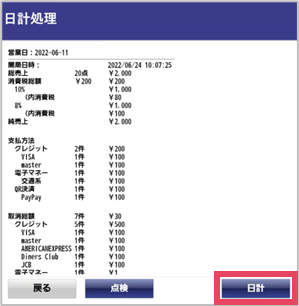 操作手順 ①[日計処理]をタップ ②[点検]をタップ ③[はい]をタップ [はい]を押すと「点検レポート」「点検レポート取引別」「点検レポート取引別(取消)」の3種類が出力されます。 「点検レポート取引別(取消)」はキャンセルがある場合のみ出力されます。 出力結果の各項目についてはこちらの記事を参照してください。