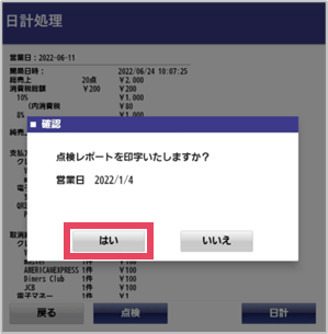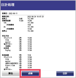 操作手順 売上金の回収:しない ①[日計処理]をタップ ②[日計]をタップ ↓ 日計処理中画面が表示され日計が印字されます。終了すると電源が自動で切れます。 「点検レポート」「点検レポート取引別」「点検レポート取引別(取消)」の3種類が出力されます。 「点検レポート取引別(取消)」はキャンセルがある場合のみ出力されます。 出力結果の各項目についてはこちらの記事を参照してください。 運用設定で、「日計処理後の動作モード」を「開局画面に戻る」にしていると、電源は切れず開局画面に戻ります。 ...