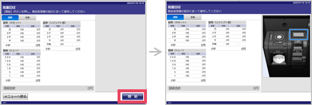 日計処理の回収動作を「残置回収」に設定していて、Kiosk内にある現金が、つり銭準備金より少ないときにこのエラーが表示されます。 以下の手順に従って現金を補充して日計をしてください。 ①[確認]をタップ ②[メニューへ戻る]をタップ ③[いいえ]をタップ [はい]を押すとSTEP1の画面に戻るため、[いいえ]を押して現金を補充してください。 ④赤く表示されている不足紙幣・硬貨を確認し[はい]をタップ ⑤[開始]をタップ 補充する現金を投入してください。 ...
