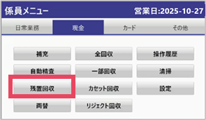 操作手順 ①[現金]をタップ ②[設定]をタップ ③[する]もしくは[しない]どちらか設定したい方をタップ 「する」を選択すると、「日計処理の現金回収動作」の[全回収]「残置回収]のボタンが押せるようになります。 全回収 :Kiosk内にある現金を全て回収します。 残置回収:つり銭準備金で設定した金額をKiosk内に残して現金を回収します。 どちらかを選択してください。 なお、「する」「しない」どちらかを選択すると設定が反映されます。更新ボタンはありません。 ...