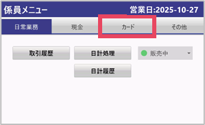 各種項目について ・日常業務タブ No. 項目 内容 ① 取引履歴 取引履歴の確認、レシートの再印字、取消処理を行います。 ② 日計処理 売上件数・金額の確認ができます。日計精算を行います。 1日の終わりに日計処理をします。日計処理後は取引のキャンセルが 出来ません。 ③ 日計履歴 過去の日計履歴が確認できます。 ④ 販売ステータス 販売ステータスが表示されます。 ・現金タブ No. 項目 内容 ① 補充 現金を補充します。 ② 自動精査 ...