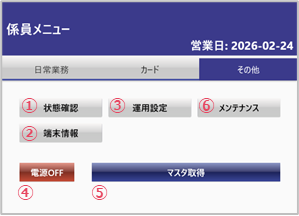 ⑥ | メンテナンス | プリンタの印字テスト、決済端末との接続テストができます。 |
