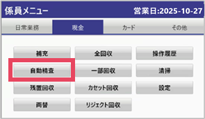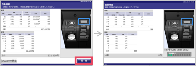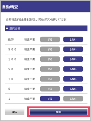 ③自動精査する金種を選択し、[開始]をタップ