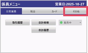 各種項目について ・日常業務タブ No. 項目 内容 ① 取引履歴 取引履歴の確認、レシートの再印字、取消処理を行います。 ② 日計処理 売上件数・金額の確認ができます。日計精算を行います。 1日の終わりに日計処理をします。日計処理後は取引のキャンセルが 出来ません。 ③ 日計履歴 過去の日計履歴が確認できます。 ④ 販売ステータス 販売ステータスが表示されます。 ・現金タブ No. 項目 内容 ① 補充 現金を補充します。 ② 自動精査 ...