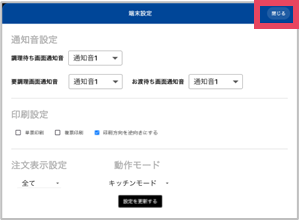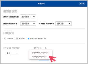 O:der Kitchenアプリでは「デシャップモード」「キッチンモード」の切り替えのみ設定できます。