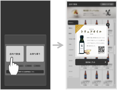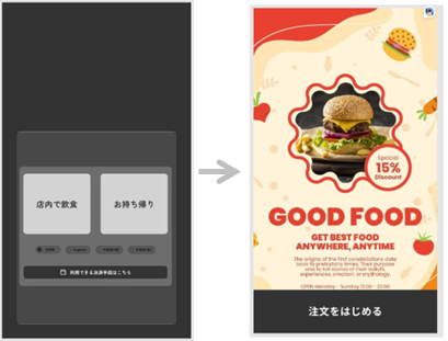 [店内で飲食]or[お持ち帰り]をタップして注文を始めようとしたときに表示されます。