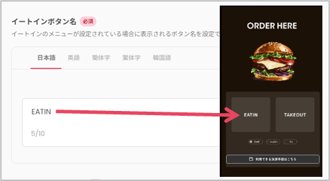 イートイン用のメニューを表示するボタン名称が設定できます。