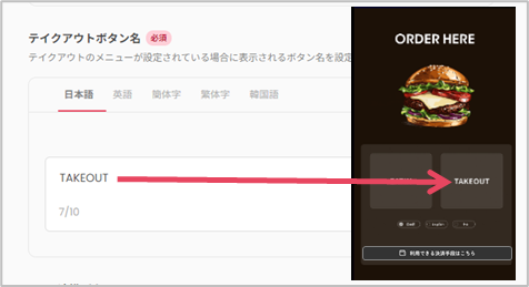 テイクアウト用のメニューを表示するボタン名称が設定できます。