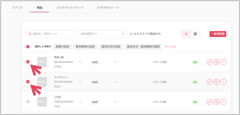 商品一覧画面で複数の商品に、売切れ・非公開の販売状況を一括で設定することができます。
