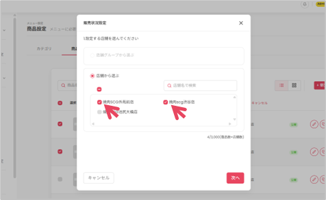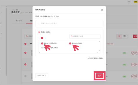 販売状況設定画面では1店舗を選択し、販売期間や売切れ/非公開の販売状況を1商品ずつ設定することができます。 一括での設定方法は、販売期間についてはこちら、販売状況についてはこちらの記事を参照してください。 操作手順 売切れにするとき ① [販売状況設定]をクリック ②対象店舗を選択し[決定]をクリック ③対象商品の「販売状況」のプルダウン部分をクリック ④プルダウン内で「売切れ」をクリック 設定すると、モバイルオーダーページでは売り切れ表示になり注文できなくなります。 ...