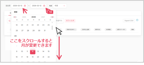 カレンダーマークをクリックし表示されるカレンダーで日付が選択できます。