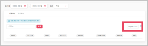操作手順 ①[O:der Table売上情報]をクリックし[ブランド単位の集計]をクリック ②確認したい範囲をプルダウンから選択 ・カレンダーで日付指定する場合 ・csvをダウンロードしたい場合 [Export CSV]をクリックするとcsvがダウンロードされます。出力項目は こちら をご確認ください。 検索結果 ■伝票単位 指定した期間内の伝票(注文)ごとに結果が表示されます。 ・伝票No :注文ごとにシステムで払い出される番号 ・ブランド名 :利用したブランド名 ...