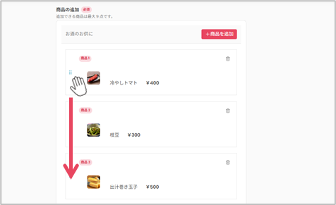<画面イメージ> おすすめグループを設定すると、商品を注文しようとしたときにポップアップでおすすめ商品が表示されます。 「商品設定>おすすめグループ」では「ご一緒にいかがですか」と表示されるグループを作成します。 所属する商品は、事前に「商品設定>商品」で登録する必要があります。 商品登録の操作方法はこちらの記事を参照してください。 操作手順 ①[商品設定]をクリック ②「おすすめグループ」を選択した状態で[新規登録]をクリック ③各項目を更新し[登録]をクリック [保存して連続登録] ...