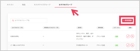 ②「おすすめグループ」を選択した状態で[新規登録]をクリック