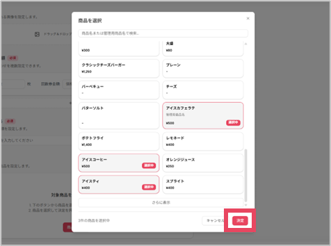 また、商品の並び替えもできません。エンドユーザー画面にも商品を選択した順に表示されます。