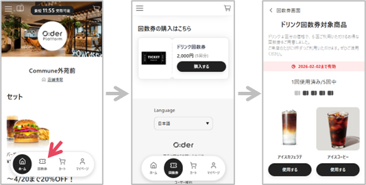 設定するとブランド内の全ての店舗に表示されますが、回数券を購入するにはO:der会員への登録が必須です。