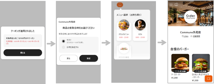 「クーポンが適用されました」の画面のあと、受取時間選択画面→メニューブック選択画面→商品一覧画面に遷移します。