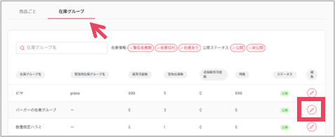 ③在庫グループを選択し対象グループの編集ボタンをクリック