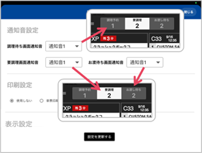 注文伝票が「調理予約」タブ、「要調理」タブ、「お渡し待ち」タブに入ったときの通知音をそれぞれ設定できます。