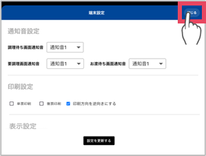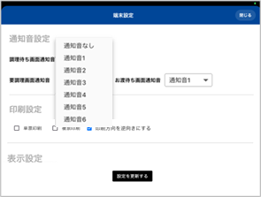 ①画面左上の[三]をタップ ②[端末設定]をタップ ③通知音を選択 音を鳴らさない場合は「通知音なし」を選択します。 注文伝票が「調理予約」タブ、「要調理」タブ、「お渡し待ち」タブに入ったときの通知音をそれぞれ設定できます。 ④[設定を更新する]をタップ ⑤[閉じる]をタップ ※設定変更をしたあと、 アプリを再起動しないと設定は反映されません。