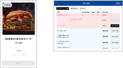 販売可能数の注文が入ると、エンドユーザー画面では「売り切れ」表示になり、O:der Kitchenアプリでは「品切れ」表示になります。