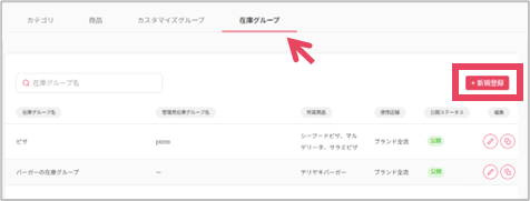 ②「在庫グループ」を選択した状態で[新規登録]をクリック