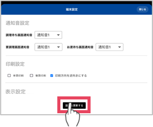 ①画面左上の[三]をタップ ②[端末設定]をタップ ③「注文受信通知表示」をタップし「表示あり」を選択 「表示あり」に設定すると注文が入る度にポップアップが表示され、 [確認しました]をタップするまで通知音も鳴り続けます。 <画面イメージ> ④[設定を更新する]をタップ ⑤[閉じる]をタップ ※設定変更をしたあと、 アプリを再起動しないと設定は反映されません。
