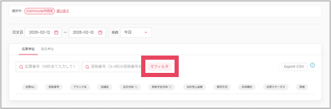 操作手順 ①[O:der ToGo売上情報]をクリックし[ブランド単位の集計]をクリック ②確認したい日付を入力 ③その他の条件でデータを絞り込む ・伝票番号、受取番号から検索 伝票番号は19桁、受取番号は3桁全て入力してください。 ・電話番号、伝票ステータスから検索   ↓ [フィルタ]をクリックし、検索条件を設定したら、最後に[適用]をクリックします。 検索結果 ■伝票単位 指定した期間内の伝票(注文)ごとに結果が表示されます。 ・伝票No    :注文ごとにシステムで払い出される番号 ...