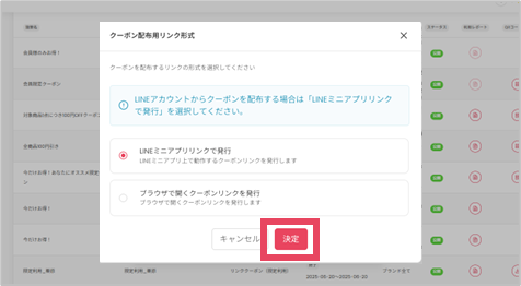 [LINEミニアプリリンクで発行]を選択し[決定]をクリックします。