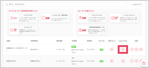 対象クーポンの「QRコード/URL」ボタンをクリックし、