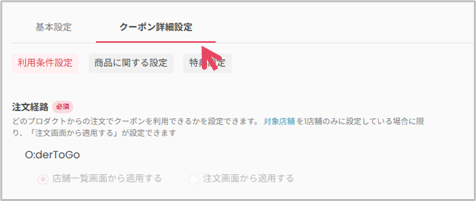 「クーポン詳細設定」のタブを選択すると「注文経路」が設定できます。
