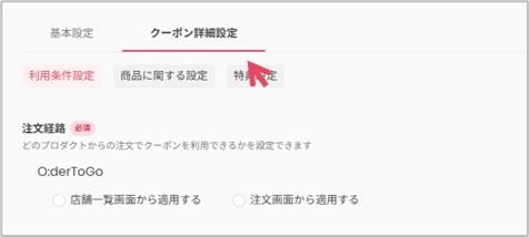 「クーポン詳細設定」のタブを選択すると「注文経路」が設定できます。