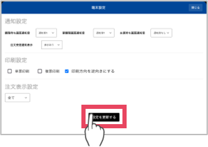 ①画面左上の[三]をタップ ②[端末設定]をタップ ③「注文受信通知表示」をタップし「表示あり」を選択 「表示あり」に設定すると注文が入る度にポップアップが表示され、 [確認しました]をタップするまで通知音も鳴り続けます。 <画面イメージ> ④[設定を更新する]をタップ ⑤[閉じる]をタップ ※設定変更をしたあと、 アプリを再起動しないと設定は反映されません。