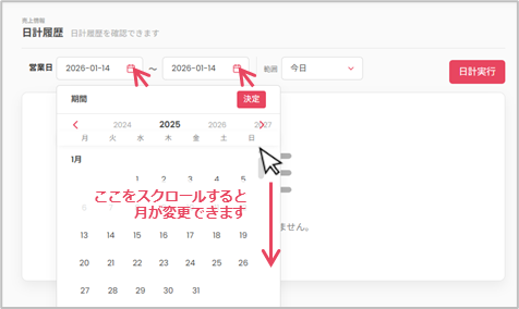 カレンダーマークをクリックし表示されるカレンダーで日付が選択できます。