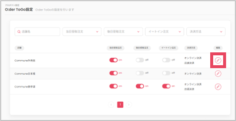 ①[O:der ToGo設定]をクリックし[店舗個別設定]をクリック