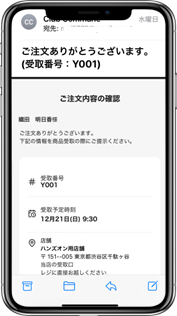 「ご注文ありがとうございます」と受取番号や店舗が書かれたメールが送信されます。