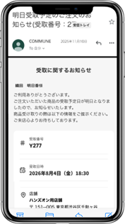 「受取に関するお知らせ」と受取番号や店舗が書かれたメールが送信されます。