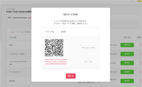 O:der ToGo Reserve設定の一覧画面でQRコードをダウンロードします。