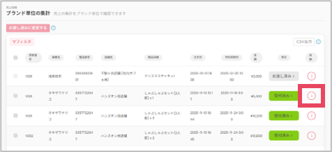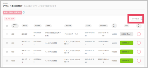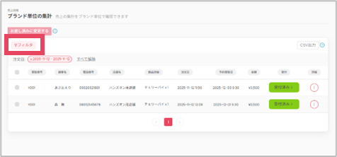 操作手順 ①[O:der ToGo Reserve売上情報]をクリックし[店舗単位の集計]をクリック ②対象店舗を選択し[決定]をクリック ③[フィルタ]をクリック 何も指定しなければ当日の注文が表示されます。 ④確認したい条件を入力し[適用]をクリック ⑤CSVファイルをダウンロードする場合は [CSV出力]をクリック CSVファイルに出力される項目はこちらをご確認ください。 「提供方法」はCSVファイルには出力されません。画面上でご確認ください。 検索結果 ...
